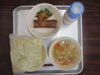 「中華めん・牛乳・野菜タンメン(汁)・春巻・チンゲンサイの中華和え」です。