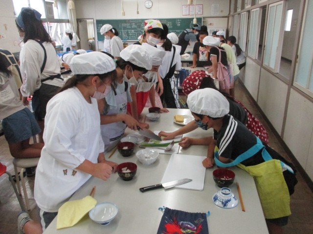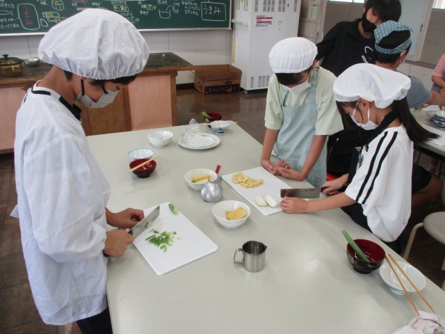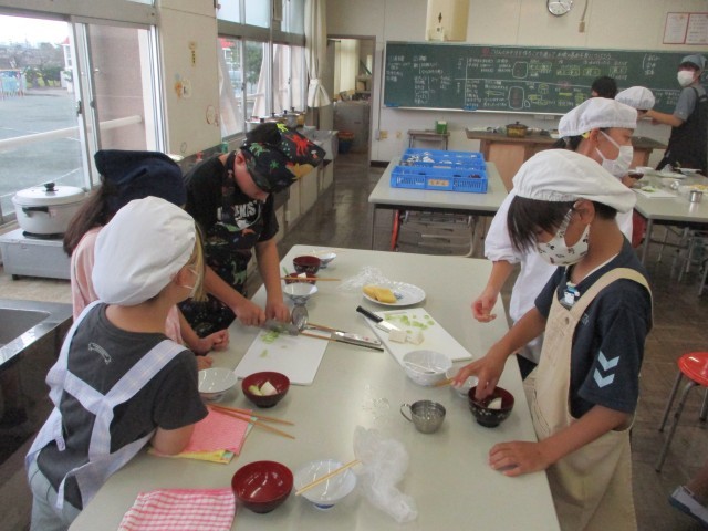 5年生は家庭科の授業で、調理実習を行いました。「だし」について学習して、みそ汁を作り、ご飯を炊きました。包丁を使い、ネギや大根を切りました。この経験を生かして、家でも料理のお手伝いがたくさんできるといいです。