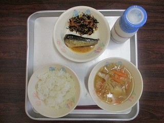 「ご飯・牛乳・いわしのしょうが煮・ひじきのそぼろ煮・おとしぼち」です。