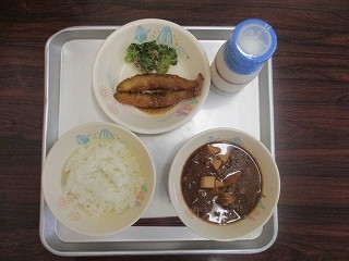 「ご飯・牛乳・ししゃもフライのごまだれがけ・ブロッコリーのおかか和え・ぶた汁」です。