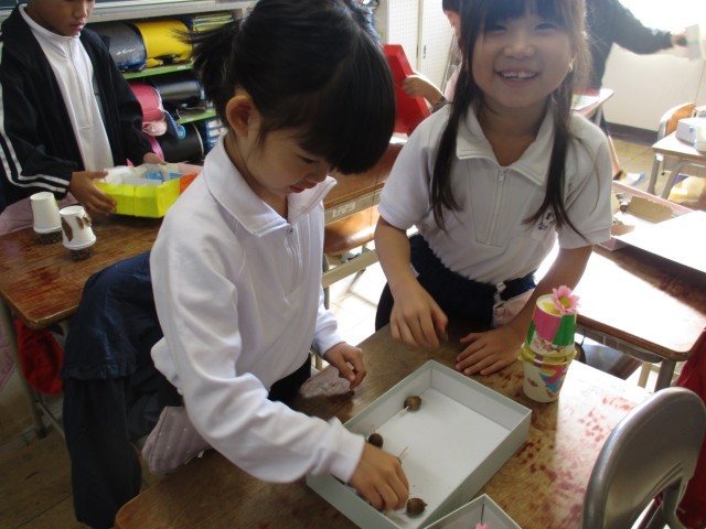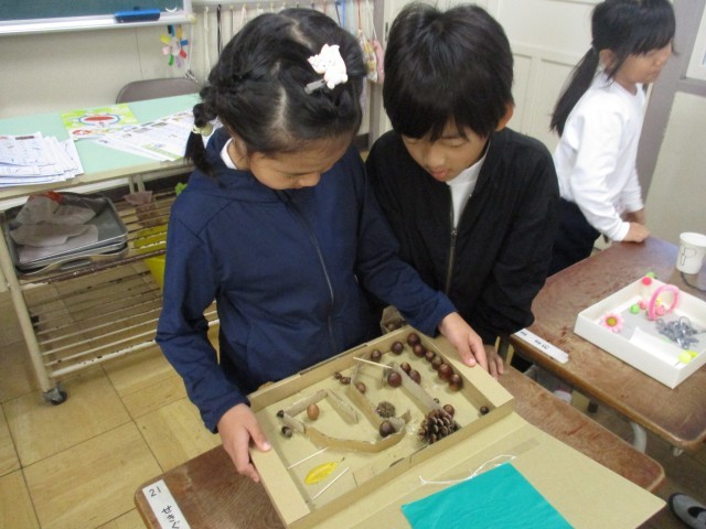 秋の実や葉っぱで作ったおもちゃで遊びました。