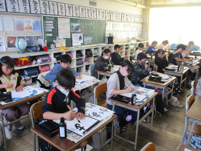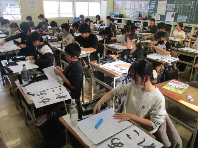 書写の授業では、毛筆に取り組んでいます。今日から、新しい字で「あこがれ」です。ひらがな4文字をバランスよく半紙に書くために練習しています。瀬部小学校の高学年として、下級生からいろいろな場面で、あこがれられる存在になってほしいと思います。