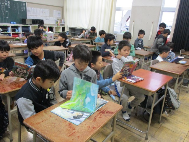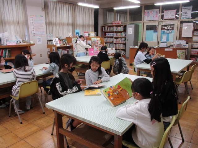 担任の先生による読み聞かせ、ペア学年による上の学年のお兄さん、お姉さんによる読み聞かせを行いました。