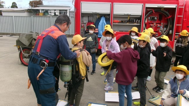 消防車の見学や消火をするときの装備などの見学をさせていただきました。