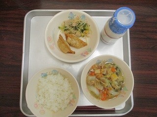 「ご飯・牛乳・八宝菜・揚げギョーザ・バンサンスー」です。