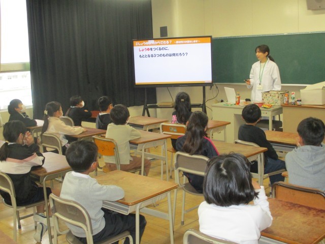 以前、国語で「すがたをかえる大豆」の学習を」しました。大豆からしょう油などが作られることを文章からがくしゅうしました。今日は、キッコーマンのしょう油博士から、材料の実物や製造工程の映像などを見せていただき、さらに学習を深めることができました。