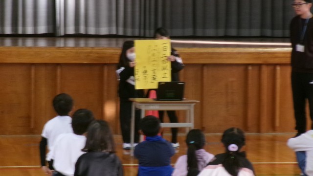 集会は、本来は屋内運動場に集まって行う予定でしたが、かぜ等が流行っているため、オンライン集会に切り替えました。