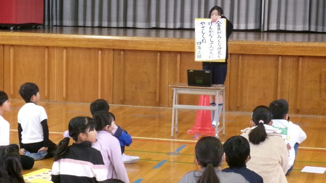クラスの代表が屋内運動場に集まり、自分たちの学級で考えた、いじめ防止標語を発表しました。