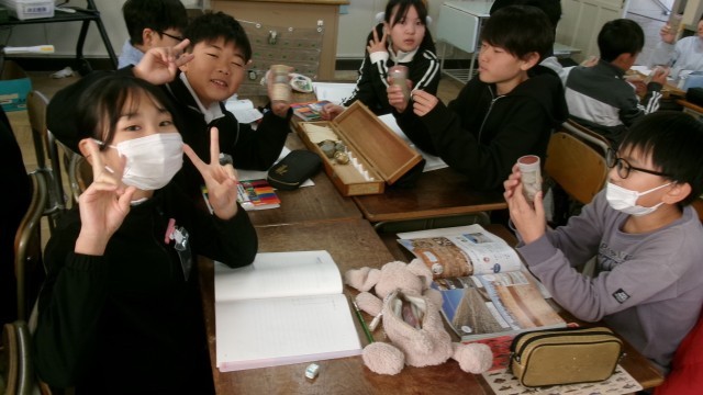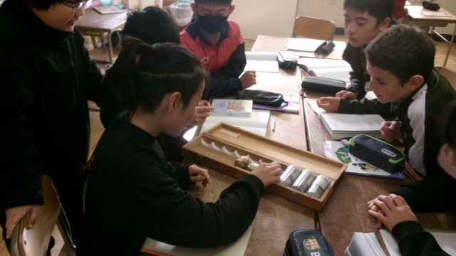 ボーリング資料の大きさや色を調べました。中にはにおいを確かめる子もいました。