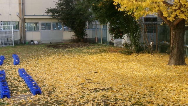中庭にイチョウが落葉し、黄色い絨毯になっています。