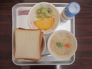 「スライスパン・牛乳・オムレツ・キャベツとウィンナーのソテー・冬野菜のシチュー・いちごジャム」です。