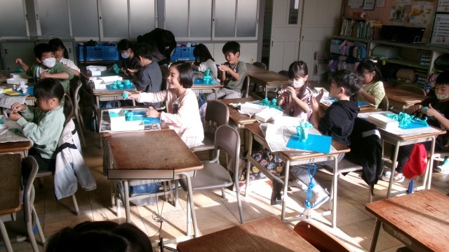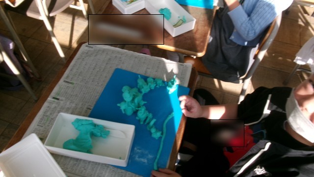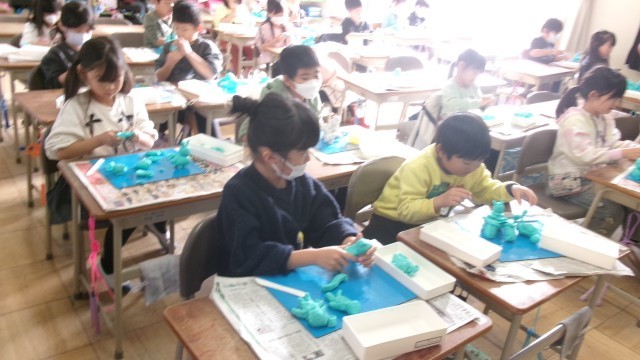 図工で一緒に散歩したい動物などの生き物をつくりました。