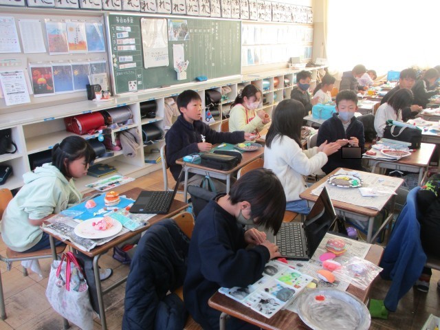 図工の授業では、1月の学習発表展に向けて、作品作りを進めています。英語の授業とも関連して、粘土で料理を作っています。色ぬりや形を工夫して制作しています。
