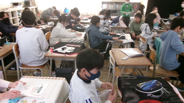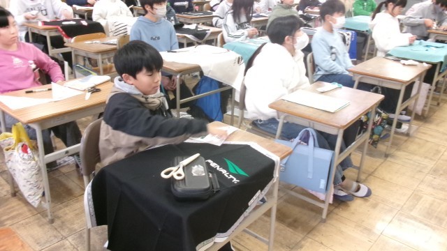 わからないところは、教え合いながらエプロンづくりに一生懸命取り組んでいます。