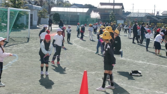 高学年児童が低学年児童に、なわとびのできるようになりたい技を教え合っていました。