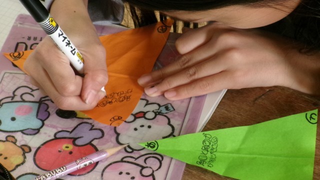 折り紙を使って、正三角形や二等辺三角形の角の大きさを調べました。