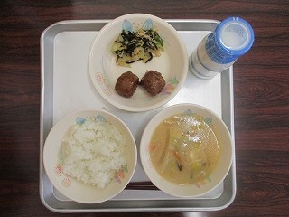 「ご飯・牛乳・肉団子・はくさいのこんぶ和え・かす汁」です。