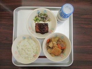 「ご飯・牛乳・関東煮・絹厚揚げの肉みそがけ・赤じそ和え」です。