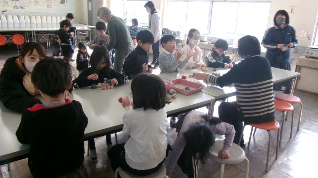 今日は地域の方から、昔の遊び、お手玉、おはじき、コマ、けん玉のやり方を教えていただきました。
