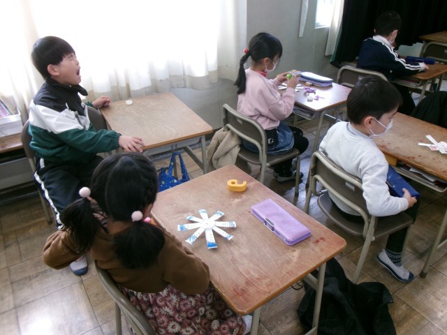 金曜日に瀬時保育園との2回目の交流があります。そこでは、年長さんと一緒に工作をします。2年生が年長さんに作り方を教えながら、一緒に作ります。そのため、今日はまず自分で作ってみて、どんなふうにできるのかを確認しました。当日はお兄さん・お姉さんらしく、優しく教えてあげられるといいですね。