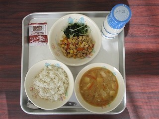 「麦ご飯・牛乳・そぼろ丼の具・ほうれんそうのおひたし・呉汁・ココアパウダー」です。