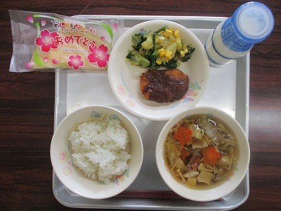「ご飯・牛乳・みそカツ・なのはな和え・湯葉のすまし汁・お祝いデザート」です。