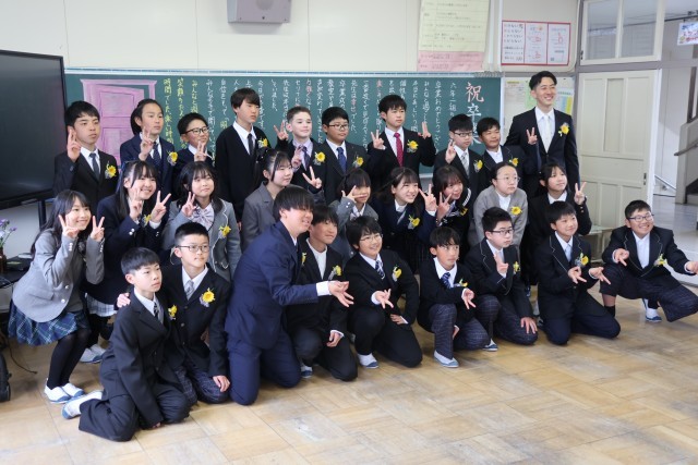 卒業式前。とても素敵な姿で登校してきました。このクラスのメンバーで入る最後の教室。集合写真も撮ってもらい、いよいよ卒業式本番。とても緊張した表情でした。