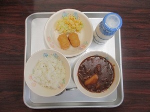 「ご飯・牛乳・ハヤシシチュー・チキンナゲット・コールスロー」です。