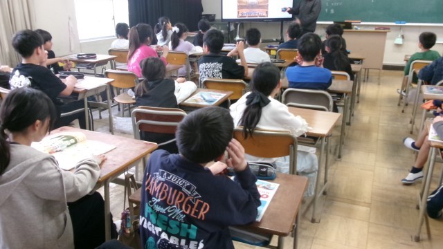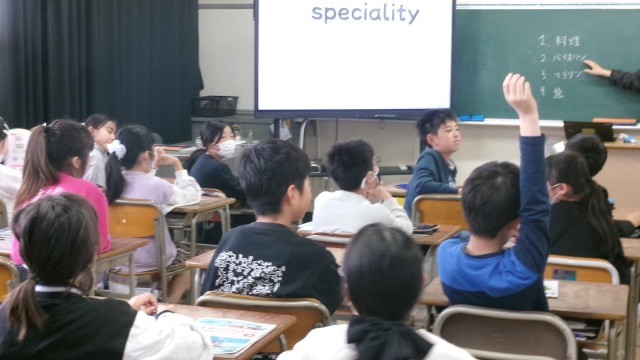 はじめての英語の授業です。英語は専科の先生なので、その自己紹介に興味津々