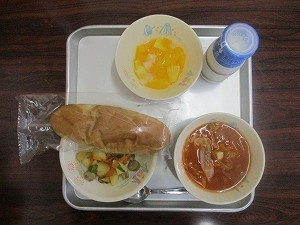 「小麦入り米粉ロールパン・牛乳・じゃがいもとウィンナーのコンソメいため・みかんゼリー和え・ミネストローネ」です。