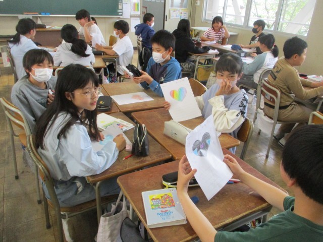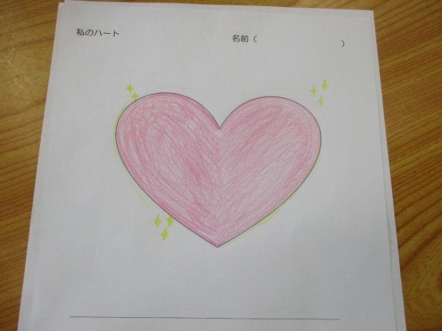 道徳の授業で、自分の気持ちをハートに色をぬることで表現しました。グループで発表することで、一人ひとり、気持ちがちがうことや相手の気持ちを考えることの難しさや大切さについて考えることができました。