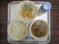今日は、大きいおかずに豆腐、ミックスみそ、大豆ペースト、小さいおかずにとうふのソフトやき、大豆ミートと、大豆製品がたくさん登場しました。大豆ミートとは、大豆を乾燥させて粒上にしたものです。豚ひき肉と一緒に、そぼろあんとして使われています。