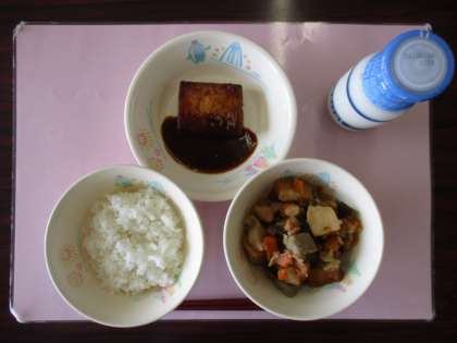 今日の献立は、ごはん ぎゅうにゅう かんとうに とうふのごまみそだれ でした。