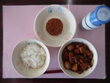 今日の献立は、ごはん ぎゅうにゅう みそおでん わふうコロッケ でした。