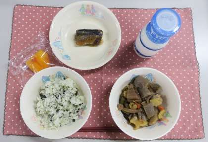 今日の給食は、わかめご飯 牛乳 秋野菜の含め煮 さんまのみぞれ煮 かき です。