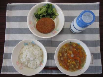今日の給食は、ご飯 牛乳 白菜とベーコンのスープ ポテトコロッケ ブロッコリーのドレッシング和え です。