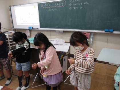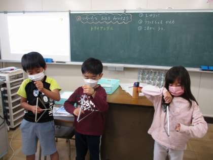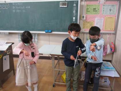 音楽の時間に、トライアングルを使って、どんな音が出せるか試してみました。