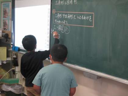 今日は三角形と四角形の性質について調べました。昨日勉強したことを生かして考えたことや気づいたことを一生懸命説明することができました。