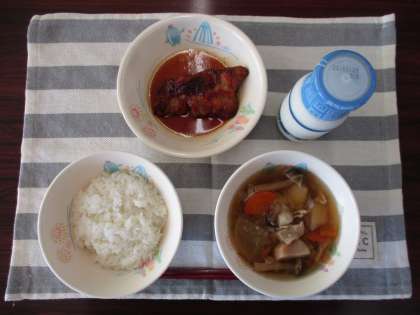 今日の給食は、ご飯 牛乳 いものこ汁 てりどり です。
