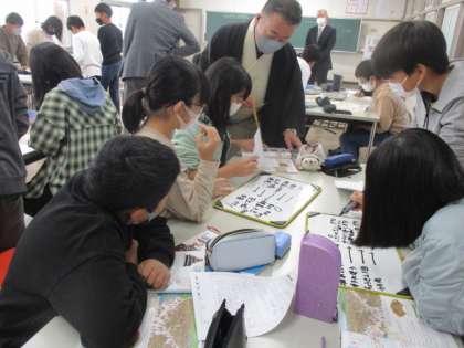 社会科で学習した内容と関連したお話だったので、グループのメンバーで協力し合い、教科書も参考にしながら間違いを探しました。