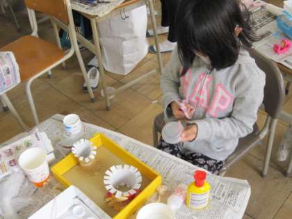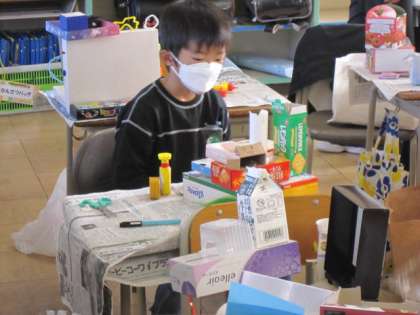 図工では、空き箱等を利用して「ともだちハウス」の制作しています。