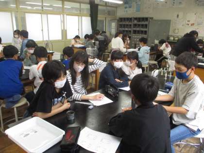上の写真は1組です。理科の授業です。火をつけて、燃え方を観察しています。