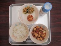 「揚げパン・牛乳・焼きフランクフルト・ブロッコリーサラダ・コーンクリームスープ」です。