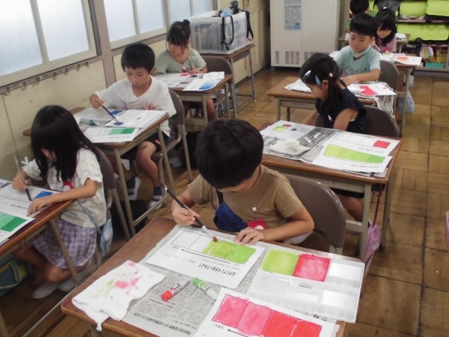 図工の時間に、絵の具を使いました。最初、絵の具セットの中に入っている筆洗やパレットなどの道具の名前を覚えました。その後、絵の具の使い方を勉強し、加える水の量を少しずつ増やして、だんだん色を薄くして塗っていきました。来週は、色を混ぜて、虹を塗る予定です。