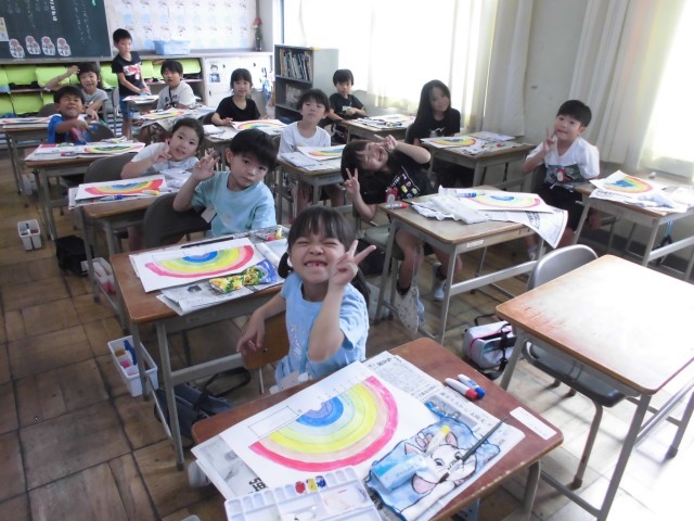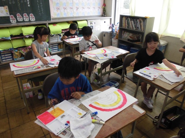 10月2日(木)1年生 絵の具で虹をぬったよ