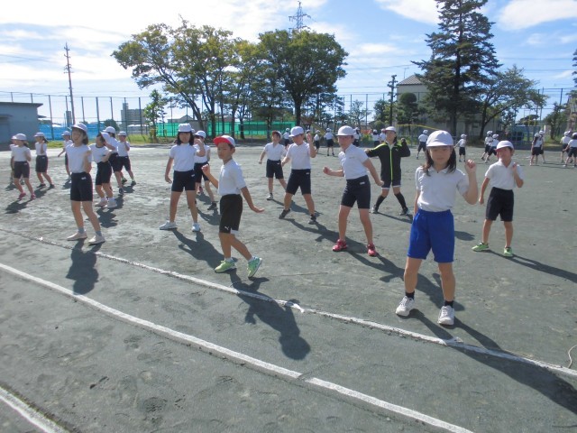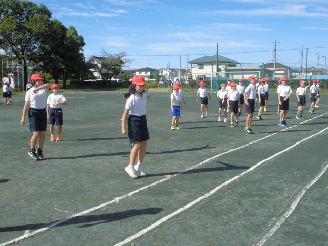 表現運動の練習をがんばっています。今週から、運動場へ出て隊形移動も含めて練習を始めました。自分の場所をすぐに覚えて、てきぱきと動くことができました。