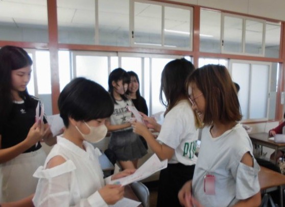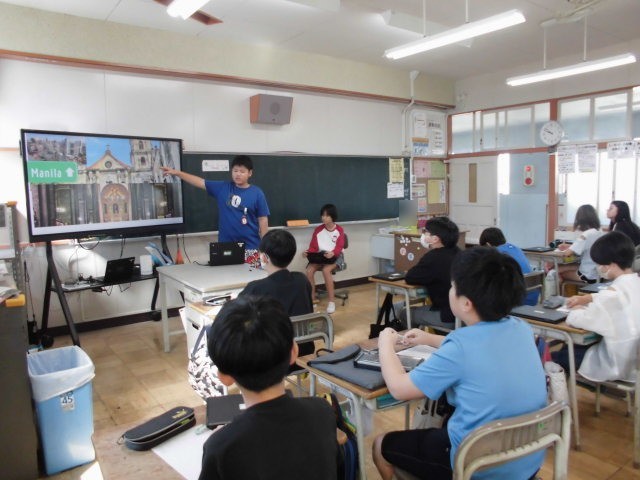 外国語の授業で興味のある国について調べ、プレゼンテーションを作って英語で発表しました。表現を工夫して、おすすめの国の魅力をくわしく伝えることができました。最後には、「この国に行ってみたい!」と思った発表者に「Travel Ticket」を渡しました。