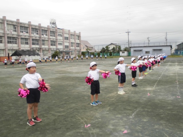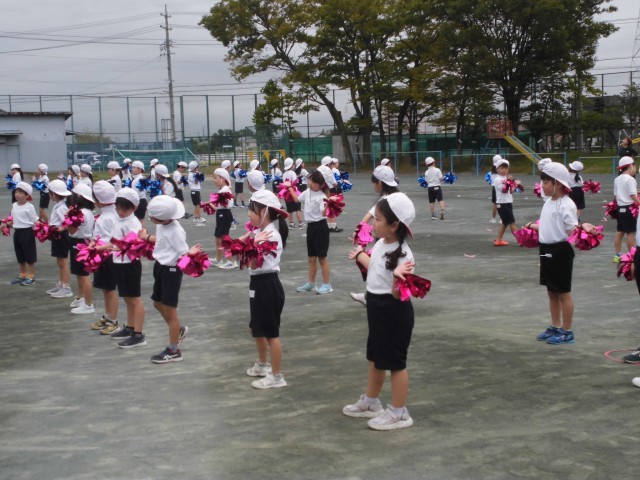 初めてポンポンをつけて踊りました。曇り空でしたが、子供たちがポンポンを動かすたびに、キラキラ光ってとてもきれいでした。本番と同じように、みんな白帽子をかぶってポンポンをつけたので、今まで以上に張り切って踊っているように感じました。ポンポンの準備をしていただき、ありがとうございました。