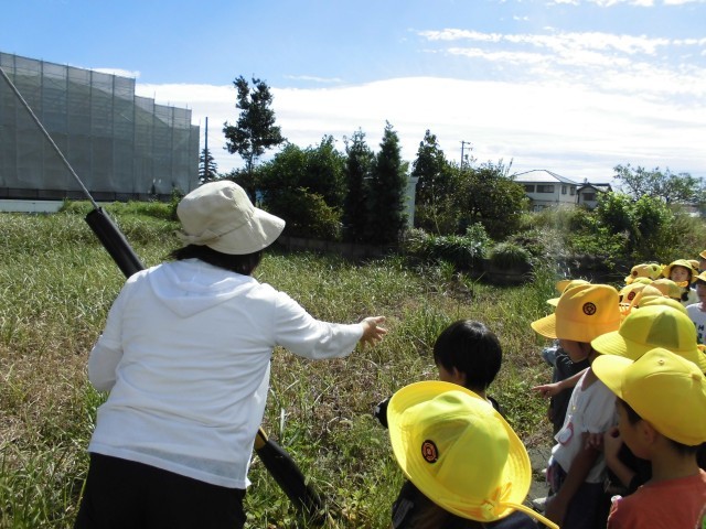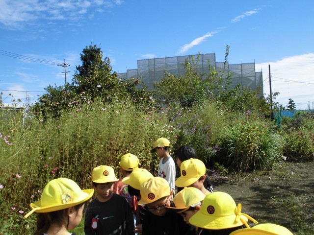 秋らしいものを探すために、学校の周りを歩きました。田んぼには、稲がたわわに実っていました。また、柿の木に、オレンジ色の実がなっていたり、コスモスの花がきれいに咲いていたりしました。ススキ、ジュズダマ、アメリカセンダングサなど、学校にはない秋らしいものをたくさん見つけることができました。