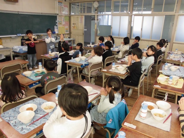 今日のとり団子汁には、とり団子、はくさい、ねぎ、にんじん、だいこん、しらたきが入っています。給食の汁物に具がたくさん入っているのは、育ち盛りのみなさんにいろいろな食材を食べてもらい、健康な成長のために様々な栄養素をとってもらいたいからです。